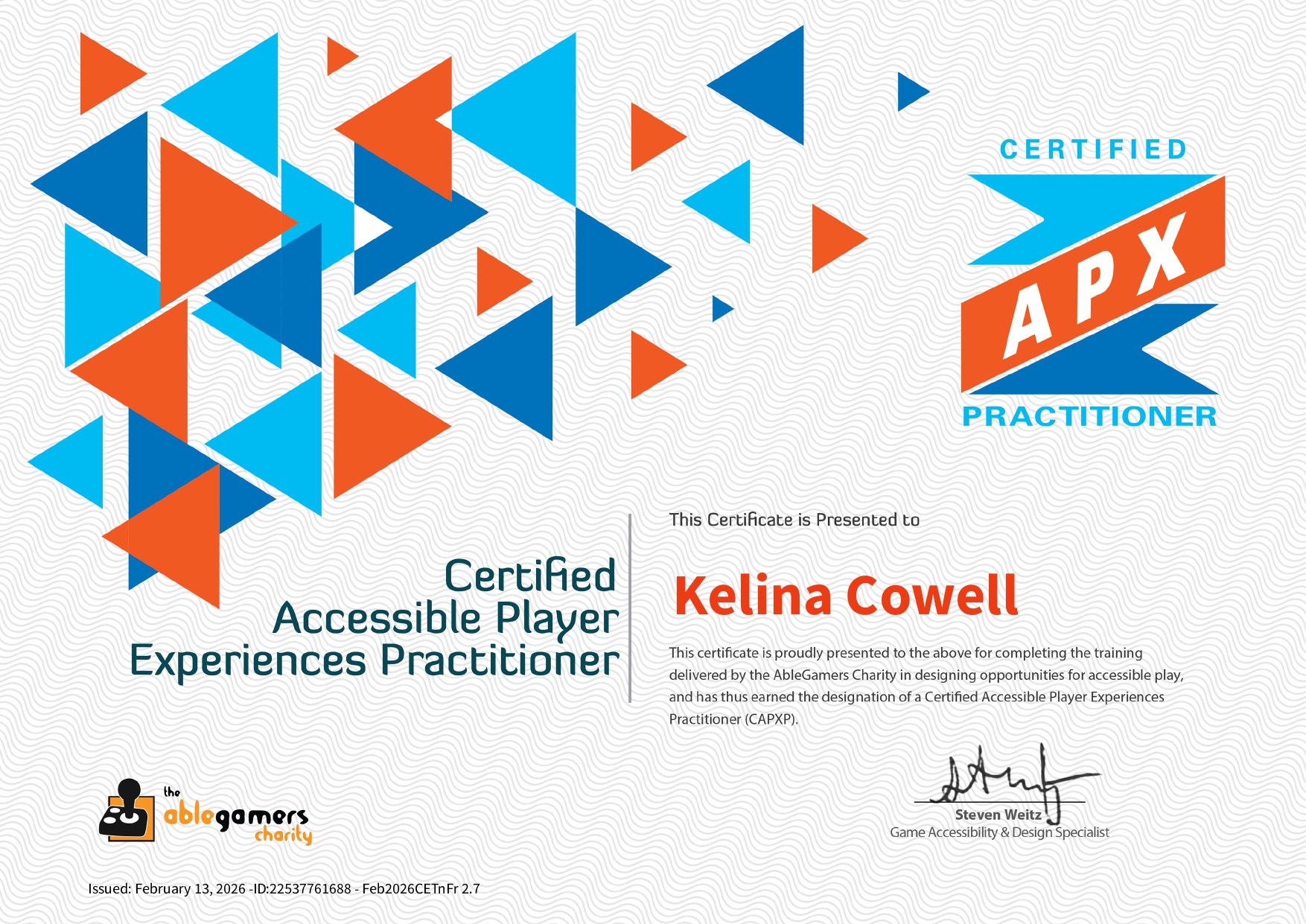 Why: Completed under full scholarship to strengthen my capability in accessibility-focused Game QA and gain a structured framework for evaluating player barriers and experience.