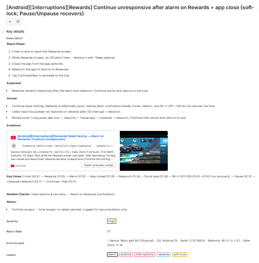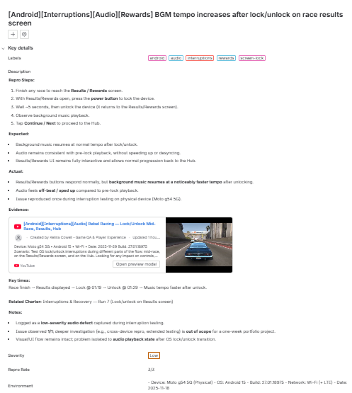 Exploratory and edge-case pass complete on Rebel Racing (Android, Moto g54 5G). I kept device coverage realistic on a single phone, ran daily golden-path smoke checks, pushed interruptions, network changes and basic scaling, and documented one high-impact rewards soft lock plus one low-severity audio issue, both with clear repro and short 1080p evidence.