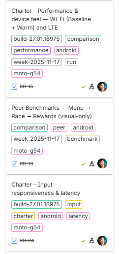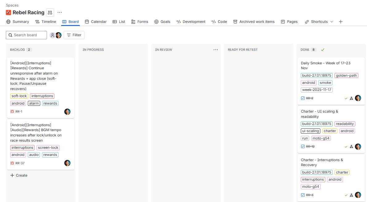 - Logged one major defect (RR-1 Rewards soft lock) with clear 1080p evidence and a full bug entry, plus one low-severity audio defect (RR-37 BGM tempo increase after lock/unlock on the Results/Rewards screen). Captured additional smaller UX and performance observations for future device and network coverage.