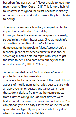Nathan Glatus (ex Senior QA / Game Integrity Analyst, Fortnite, Epic Games) helped me set the initial scope. His advice was to treat Rebel Racing as what it is: a live mobile F2P racer, not a lab toy for every possible edge case. That translated into a small set of focused charters rather than a giant “test everything” list: daily golden-path smoke on a single physical device, input and handling tiers, collisions / exits and race flow, and UI scaling and key live surfaces (store, events, hub). He also pushed me to keep runs to realistic 45–60 minute sessions with clear exit criteria, and to write tighter bug reports with strong oracles, clear summaries and bundled evidence (video, device/build metadata, repro steps, repro rate) instead of vague “it feels off” notes. His framing around realistic coverage on an approved device list is why this case study is scoped to one main phone but documented in a way that could scale to a real QA team.