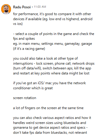 Radu Posoi (Founder, AlkoTech Labs, ex Ubisoft QA Lead) then helped me iterate the scope so it matched how mobile QA is actually run day to day. His feedback led me to define clear performance anchors (hub, pre-race, race start, mid-race, results) instead of vague “seems fine” checks; treat interruptions as a first-class surface covering lock screen, app switching, app kill and recovery, and notification shade; and turn battery, heat and multi-touch stress into dedicated charters rather than random one-off experiments. Because Rebel Racing blocks standard Android Studio emulators on the Play Store, he also recommended using Bluestacks as a visual-only oracle for odd aspect ratios and layout stretch while keeping all real testing and bug reproduction on my physical Moto g54. That combination turned my original “nice to have” ideas into a concrete device and network approach that looks like a small slice of a real mobile QA lab rather than a student project.