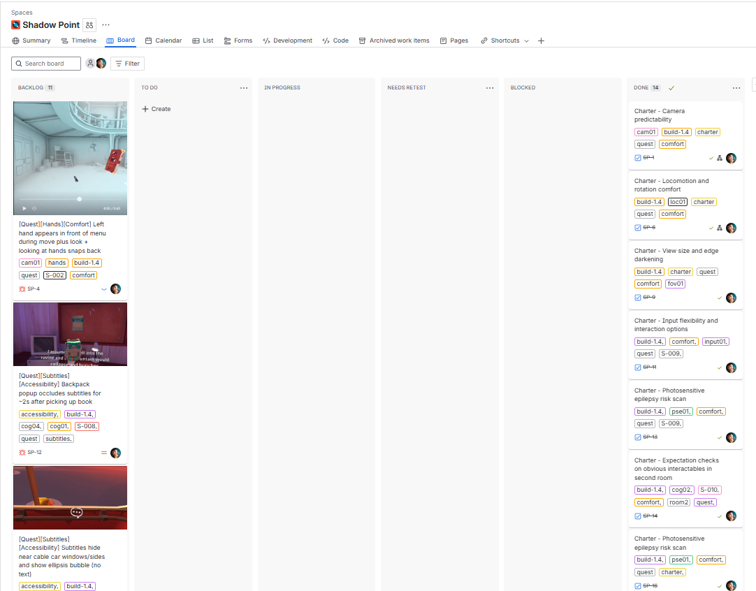 Result: Across a one-week, charter-driven accessibility and comfort pass on Shadow Point (Meta Quest 3, standalone, build 1.4), I completed 20 logged sessions and recorded 11 issues in the Bug Log (7 medium, 4 low), each with captured evidence and a recorded repro rate.