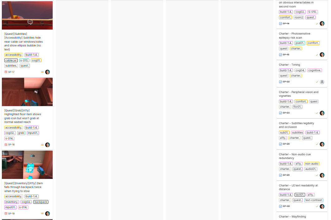 Charters and checks were informed by established XR accessibility guidance and applied insight from industry practitioners, including Ian Hamilton’s VR comfort principles, BBC XR cognitive barriers, W3C XR Accessibility User Requirements, Game Accessibility Guidelines, and practitioner feedback from Dr Tracy Gardner on cybersickness and movement risk. These frameworks were used to shape charter design, session focus, and how findings were framed and prioritised.