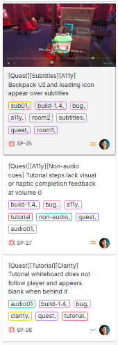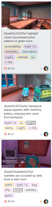 - Primary theme: subtitles (accessibility and readability). Multiple issues centred on subtitle legibility and occlusion, including UI overlays and held objects obscuring subtitles, and subtitle behaviour during the cable car sequence (SP-12, SP-17, SP-24, SP-25).