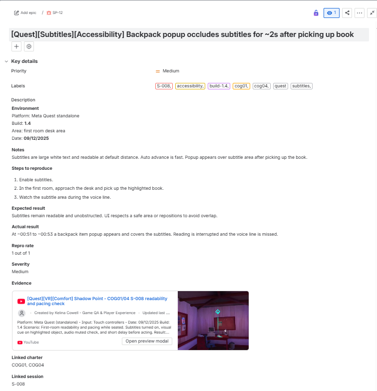 Result: Logged 11 issues in total (7 medium, 4 low), with reproducibility recorded per issue (1/1, 2/2, or 3/3). The main risk areas identified were subtitle accessibility (readability and occlusion), early-game clarity and confirmation gaps when audio cues were removed, and seated interaction and UI clarity issues in Room 3. Comfort checks for movement, turning, and stability were also exercised across multiple sessions, with findings recorded against the relevant charters.