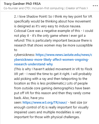Dr Tracy Gardner PhD FRSA (Co-founder and CTO - Flip Computing & Flock XR) reinforced that movement design is one of the highest risk areas for VR accessibility because poor locomotion can trigger nausea and put players off VR entirely. Her feedback helped frame locomotion and rotation checks as access barriers and retention risks, not just “comfort preferences”, and it pushed me to strengthen checks around text controls and multi-modal communication.