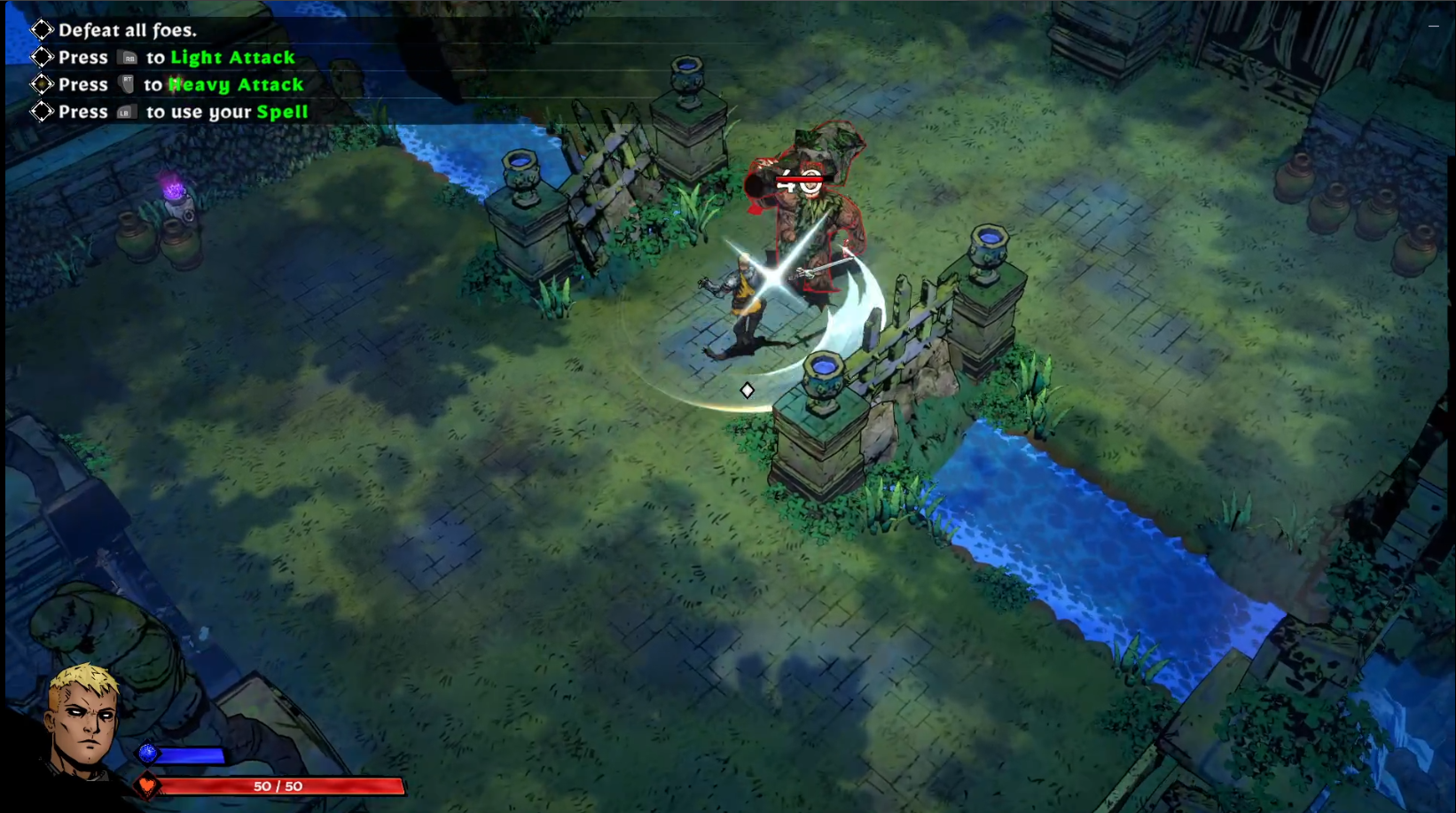 - Death-flow defect (SWOR-6): the Defeat overlay remains foregrounded after death, blocking the Stats panel. Pressing Continue immediately starts a new run. Reproduced reliably and captured on video.