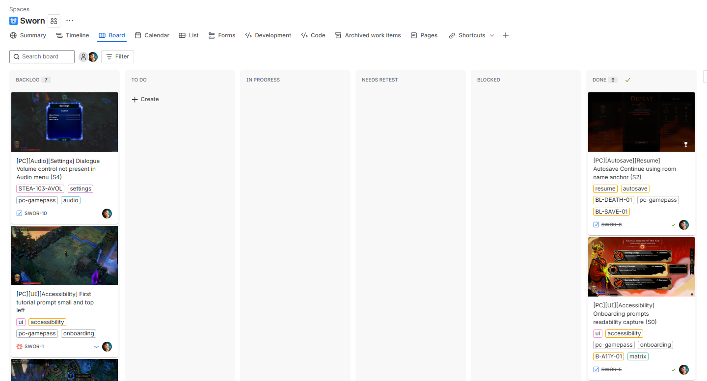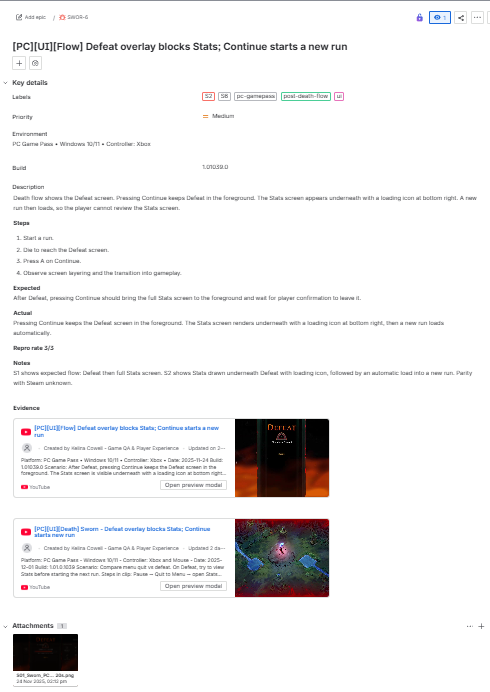 Result: The PC Game Pass build of Sworn remained stable across all golden-path and targeted regression checks. Six defects were logged in total: four onboarding accessibility prompt issues (SWOR-1–SWOR-4), one medium-severity death-flow defect (SWOR-6), and one medium-severity Blessing choice readability issue (SWOR-15). All reproduced consistently and are fully documented with evidence.