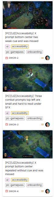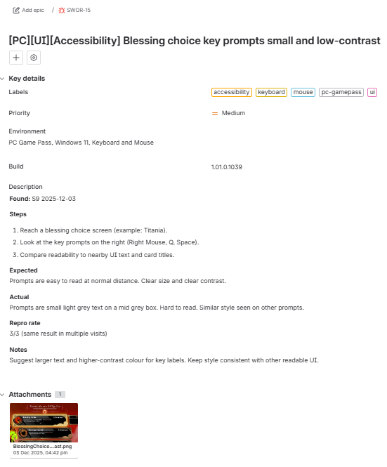 - Readability issues aren’t cosmetic. The Blessing choice prompts (SWOR-15) showed how low-contrast, cramped UI slows decision-making and can exclude players who need clear visual cues.