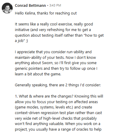 During this project I didn’t guess the scope in isolation. I shaped the regression plan around targeted guidance from senior QA professionals, treating this as a miniature live-ops assignment instead of a theoretical exercise.