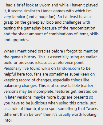 I applied this by redesigning my Regression Matrix so that every entry ties to a specific change, a stability requirement or a coverage slice. For Sworn, historical-oracle references were not required because the SteamDB patch notes already provided sufficient clarity on what had changed.