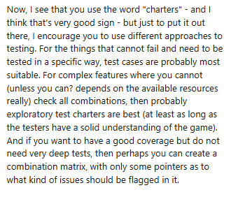 - Match the test approach to the surface: scripted test cases for critical flows, exploratory charters for large or complex spaces, and lightweight matrices for broad variable sets that don't need deep test-case detail.