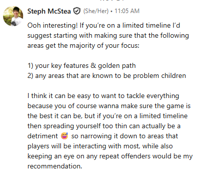 Steph McStea (QA Lead at Double Eleven) reinforced the importance of focusing on the golden path and known “repeat offender” areas when time is limited. Instead of touching every system in Sworn, I centred the regression on what most players hit every session and gave extra attention to clusters already known to be fragile from earlier testing. This kept the plan achievable for a one-week solo regression while still mirroring how real studios prioritise player-impacting surfaces.